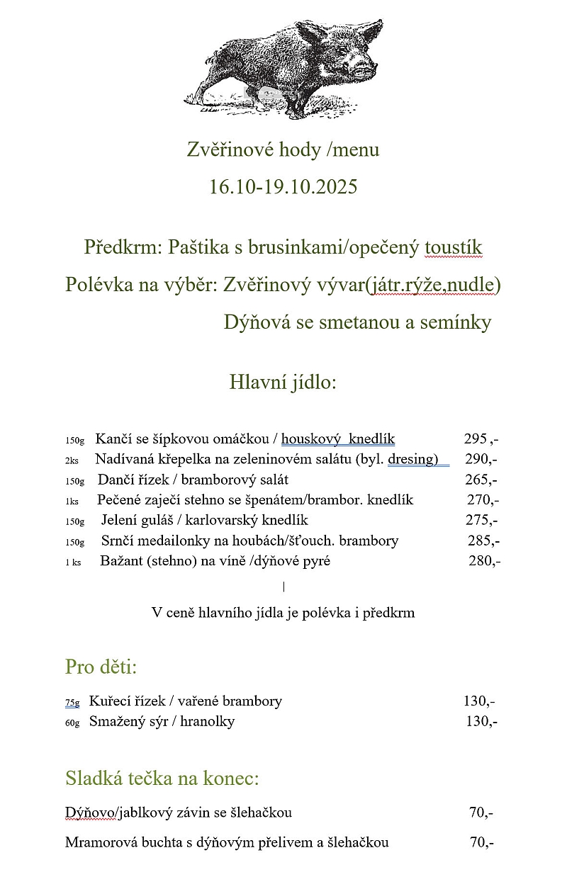 Zvěřinové hody 16. až 19. 10. 2025 - jídelní lístek